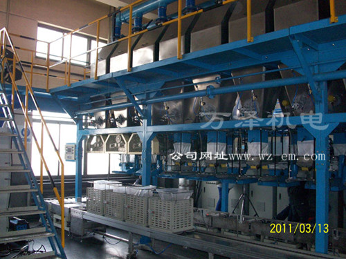 人工將配料袋套與配料筐上,配料筐在升降運輸側輥道、運輸定位輥道、電子配料秤、電子校核秤上自動運行。配料時,各料筐按工藝配方要求,自動運行至相應電子配料秤上并定位,自動扣除皮重,加料器便向配料筐內加料進行計量配料,計量完畢各配料筐自動運行至下一工位。
